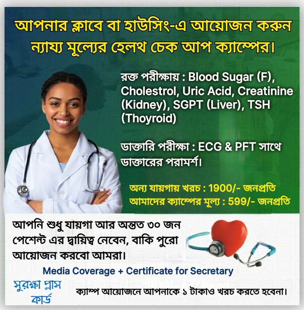 Our camps include essential diagnostic tests such as blood sugar, cholesterol, kidney and liver function tests, thyroid screening, ECG, and PFT, along with medical consultation by qualified doctors—all at a highly subsidised rate.